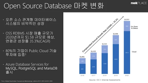 자기 것만 고집하기로 소문난 Microsoft가 “I love open source” 혹은 “I love Linux!”라는 문구를 스스럼없이 쓰고, 작년에는 천문학적인 돈을 투자해 오픈소스 커뮤니티의 상징처럼 여겨지는 GitHub (깃허브)를 인수했죠. 데이터베이스 SW 시장의 터줏대감이라는 Oracle 웹사이트에도 오픈소스 DB 이야기가 많은 부분을 차지하고 있습니다. 이 정도면, 오픈소스가 IT 역사의 한 페이지를 장식하는 큰 흐름이 되었다고 해야 할 것 같습니다. 오픈소스 전문 기업인 락플레이스의 역할이 더욱 중요해지는 시기가 오고 있는 것 같습니다. 그래서 오늘 포스트에서는 오픈소스 데이터베이스 시장의 현황을 정리해 보았습니다. 1. Opensource database, 더욱 빨라지는 성장과 시장..